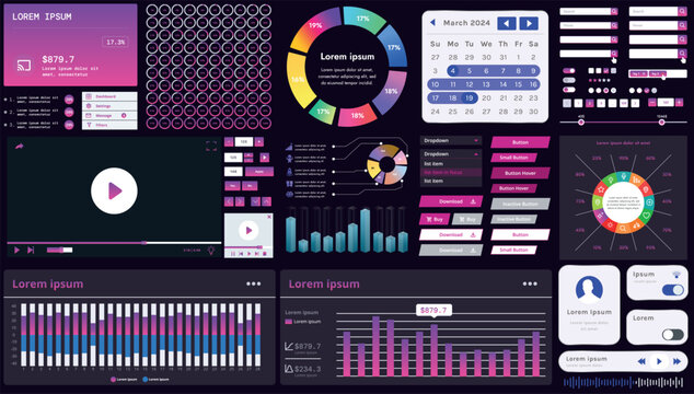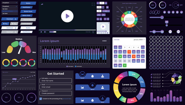 A set of modern interface elements for business applications and websites: buttons, charts, menus, graphs, and other interactive components for easy navigation and analytics.