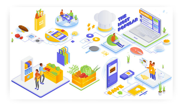 Healthy nutrition. Popular online food recipes, cooking books, fast and easy no cook dinner ideas, vector illustration.