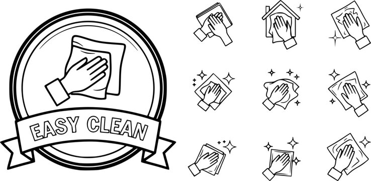 Easy clean icon set. Hand with napkin wiping a surface. Housekeeping symbol. Easy clean logo, label, badge, symbol, banner, circle, black, line, vector, isolated illustration. Cleaner service logo.