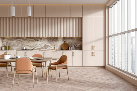 Modern youth hostel building.  Kitchen and eating areas. Two ovens, kettle and toaster.