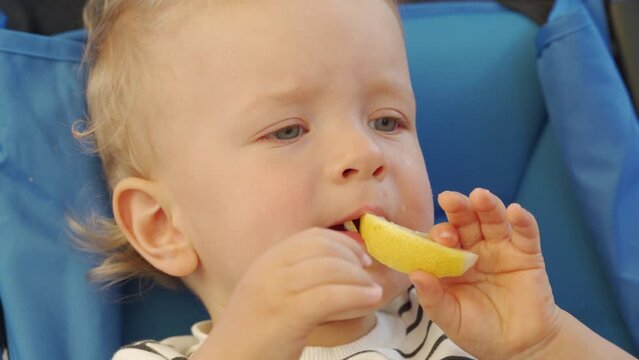 Baby boy eating lemon for the first time and pulling silly faces. Funny child trying lemons for the first time.