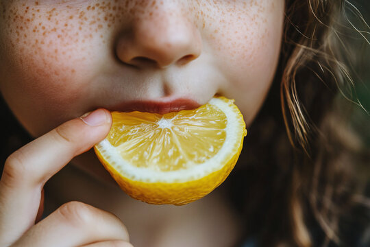 Close up of girl child eating lemon fruit
