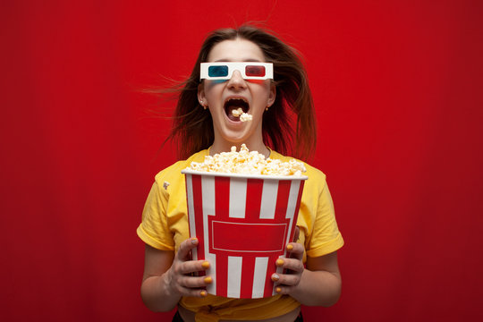 Excited tourist man in 3D glasses enjoying eating popcorn and watching interesting tv serial sport game, film, online social media movie content. Young boy isolated alone on yellow studio background