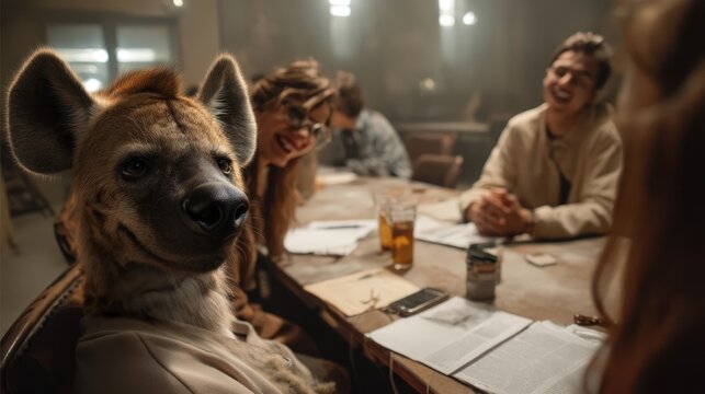 An intriguing and whimsical image showcases a hyena with a surprisingly human-like expression, seated at a table among friends sharing laughter. This surreal and humorous scene blends wildlife and hu