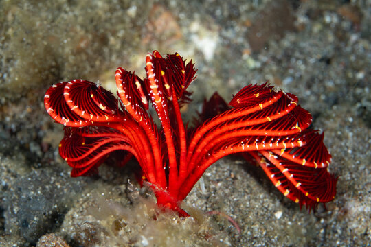 A bright red feather star, or crinoid, waits for food to drift near its articulated arms in Raja Ampat, Indonesia. Crinoids are ancient echinoderms found throughout the oceans.