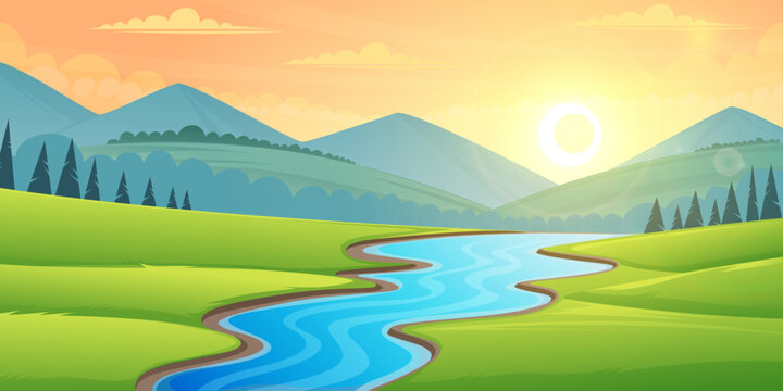 sunrise, morning scene, river  through a lush green valley cartoon illustration