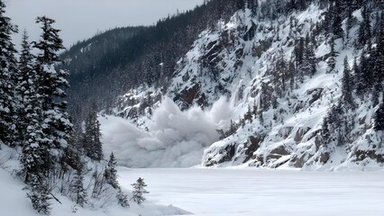 A massive avalanche erupts from a snow-covered cliff into a frozen mountain valley, surrounded by snowbound pine trees. Concept Avalanche erupting in frozen valley, Snowbound pine forest