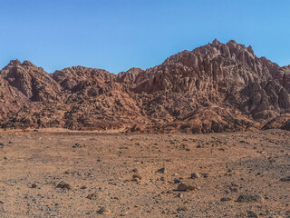 Martian landscape in Echo Valley near Sharm El Sheikh, Egypt. Orange-brown bare stone mountains in the Sinai desert