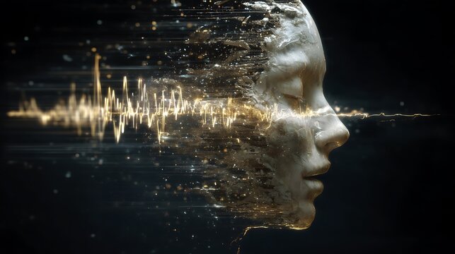 a contemplative human face disintegrating into sound particles, conceptual echo chamber of thoughts, dark background with glowing frequency waves