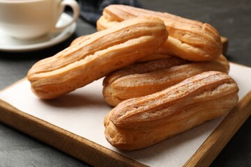 Freshly baked chocolate eclairs cooling on a wire rack are a classic French pastry dessert.