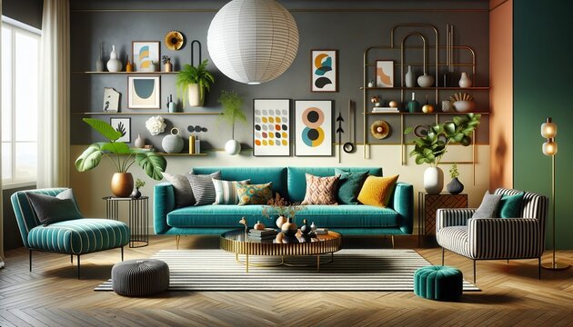 teal sofa and eclectic decor blend mid-century with modern vibes