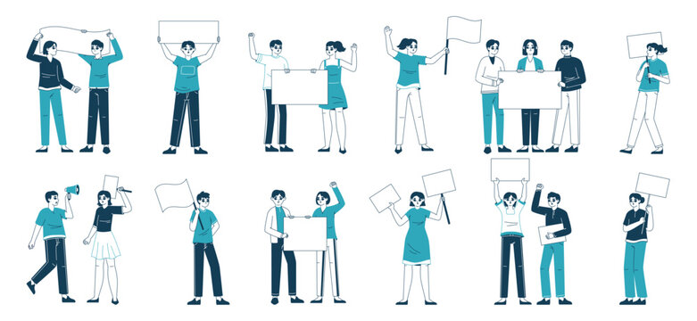 Demonstration, protesters characters, protesting eco or political activists. Outline people crowd holding empty placards and banners flat vector illustration set. Manifesting activists collection