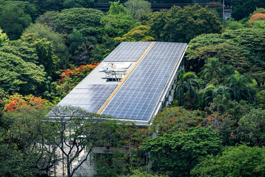Solar panels cover rooftop of energy efficient building. Climate adapted design, renewable energy and powers efficiency, green energy sustainability, urban eco infrastructure with alternative power