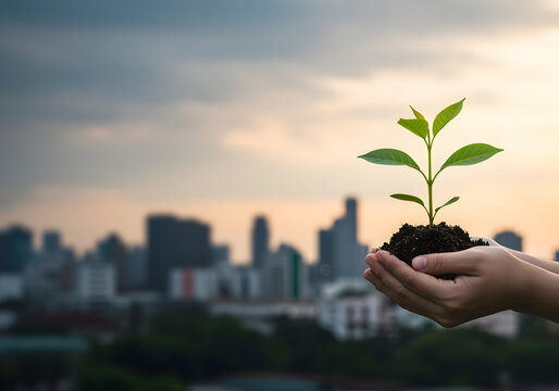 Single hand holding soil with green seedling and urban skyline in soft evening light