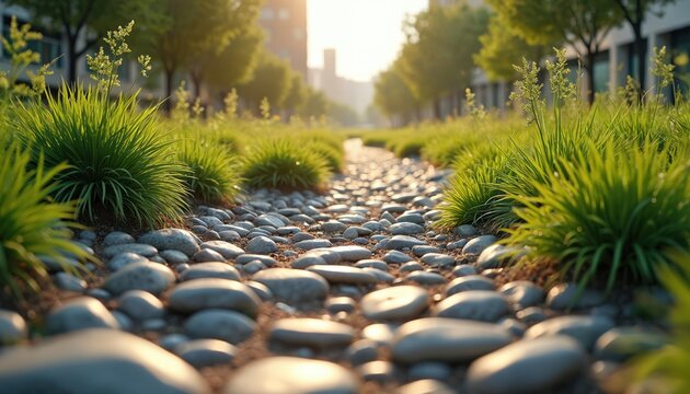 Urban rain garden with green plants, gray stones. Pathway in city park with tall buildings, trees. Sustainable landscaping design for stormwater management. Green infrastructure in modern city. Eco