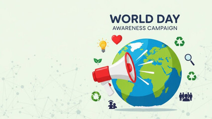 World day awareness campaign with globe and megaphone surrounded by eco friendly symbols and people icons on light green background