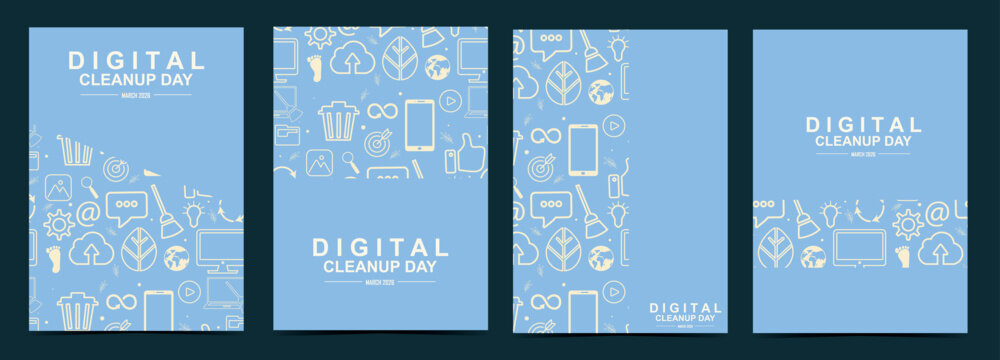 mockups for Digital Cleanup Day March 2026 featuring white line icons patterns of tech devices, trash bins, leaves, and eco symbols, ideal for digital sobriety event. Green IT. Vector illustration