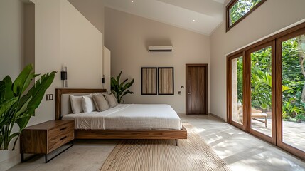 Modern Bedroom Interior with Teak Furniture, Brass Accents, Bamboo Panels, and Wood-White Wall Design