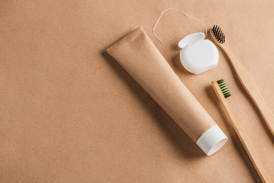 Eco-friendly toothpaste, dental floss and bamboo toothbrushes on craft paper