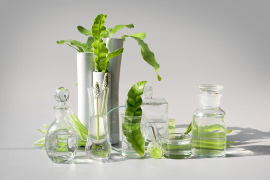 Natural Green laboratory. Abstract floral arrangement on light purple background. Exotic green leaves in transparent glass flasks, vials, Petri dishes. Reflections, floral elements distorted in water.