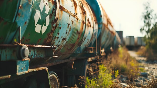 An aged, rusty fuel tank adorned with a recycle symbol, indicating environmental awareness and the importance of repurposing old industrial materials.