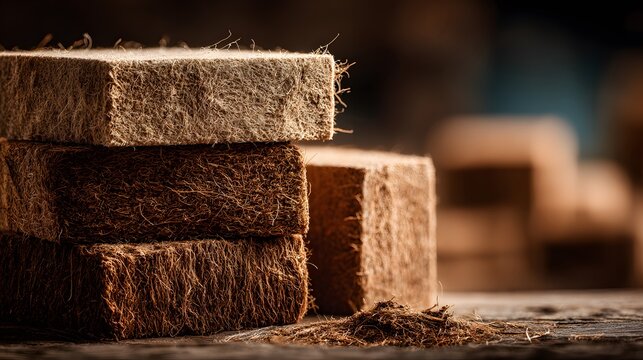 Stack of rectangular coconut coir bricks showing fibrous texture detail with shallow depth of field, warm natural tones, and eco concept.