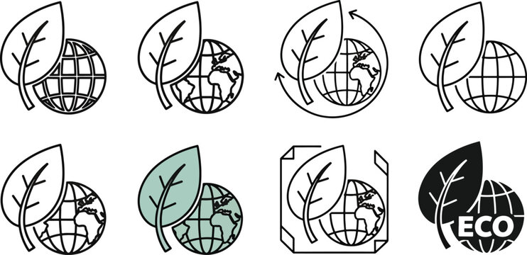 Eco Friendly Green Ecology Icon Set Featuring Earth Globe and Leaf Symbols for Sustainable Environment Protection and Renewable Energy Conservation Branding