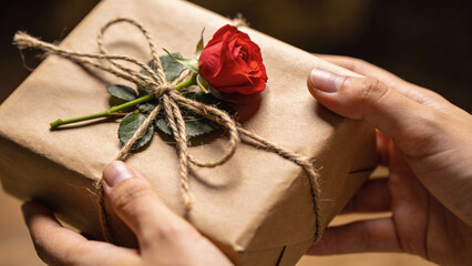 Close up view of hands holding rustic gift box wrapped in eco friendly brown paper for valentine day celebration loving surprise