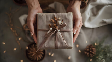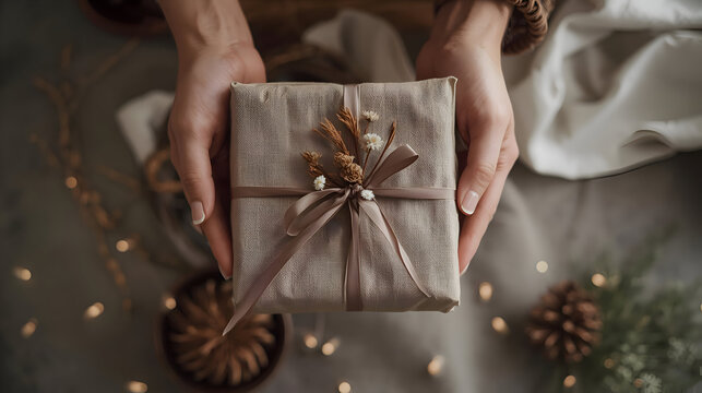 Flat lay of eco friendly gifts with dried orange slices on white wood