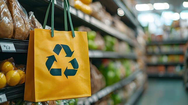Eco-Friendly Shopping Bag with Recycling Symbol in Grocery Store