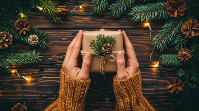 Eco friendly handmade gift packaging on wooden table  sustainable christmas decor ideas for holidays