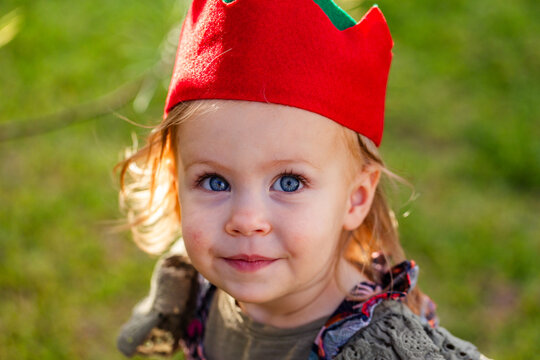 Blue eyed little girl wearing red Christmas cracker hat looking up