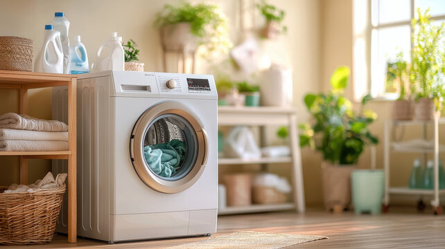 Laundry vector illustrations set, doodle collection of washing machines, detergents, clean towels, baskets, cleaning tools for home, household equipment and fabric care, storage orginization at home