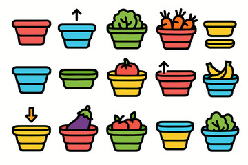 Eco-Friendly Essentials. Low-waste household supplies flat set: compost caddy, silicone food cover, refill pouch, wooden clothespin, linen towel, glass storage jar, eco scrub pad,