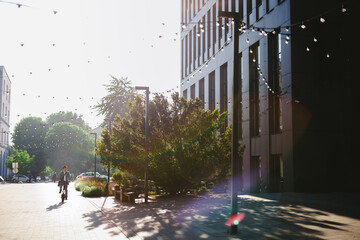 Young man happily rides an electric scooter in a busy city, symbolizing adventure and freedom. The eco friendly transportation captures modern urban life