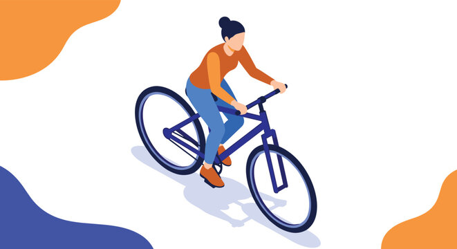Isometric illustration of a woman riding a blue bicycle across a white background with abstract orange and blue shapes.