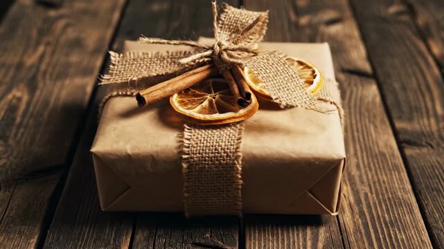 Spinning view of an eco friendly gift package tied with thick textured natural fiber cloth and rustic dried orange slices rotating on a weathered wooden plank background decorative, package, slices