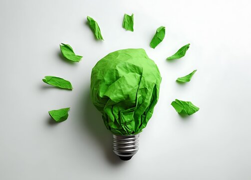 Green crumpled paper lightbulb idea eco friendly sustainable innovation concept