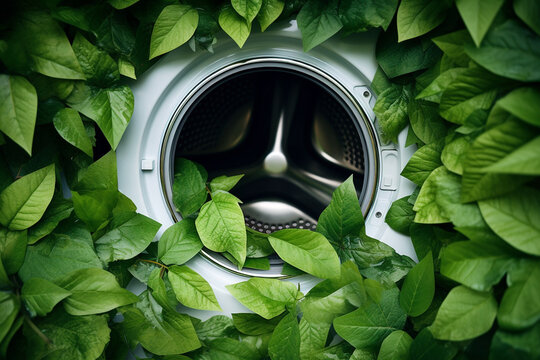 Washing machine with green leaves in it. Eco cleaning, eco friendly washing concept. Environmentally friendly bio natural home cleaning. Plants near modern washing machine. Spring cleaning theme.
