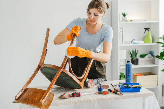Woman restoring furniture using sandpaper in workshop