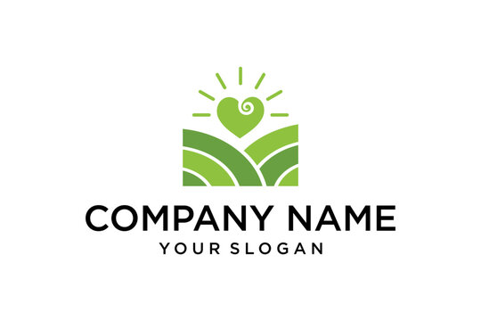 Green heart and layered fields logo with sun rays for organic agriculture and nature care.