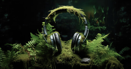 headphones earphones headset made of forest green moss concept of podcast audio sound about nature eco sustainable environment care for planet or calm relaxing training music