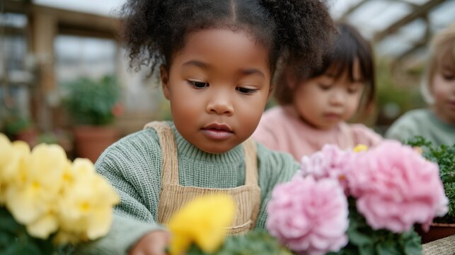Children working together in a greenhouse, learning gardening skills and teamwork. Educational lifestyle photo for schools, eco projects, child development and sustainability campaigns