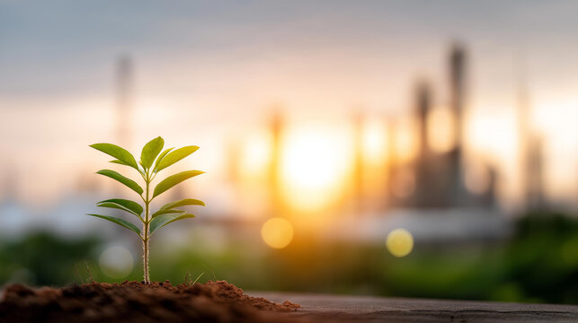Plant in foreground with oil refinery in background, nature versus industry contrast, environmental juxtaposition, green life amid industrial setting, ecological concern visualizat