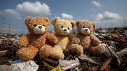 Three teddy bears sitting together amidst scattered garbage under a bright sky, evoke mixed feelings of warmth and environmental concern with the backdrop of waste.