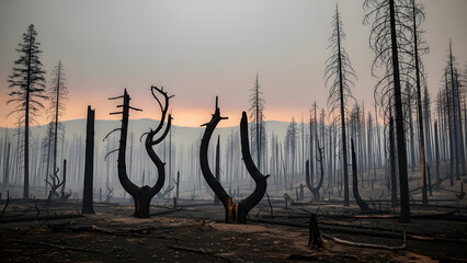 Stark desolation in a forest after a devastating wildfire, with charred skeletal trees under a hazy sky, profound ecological destruction