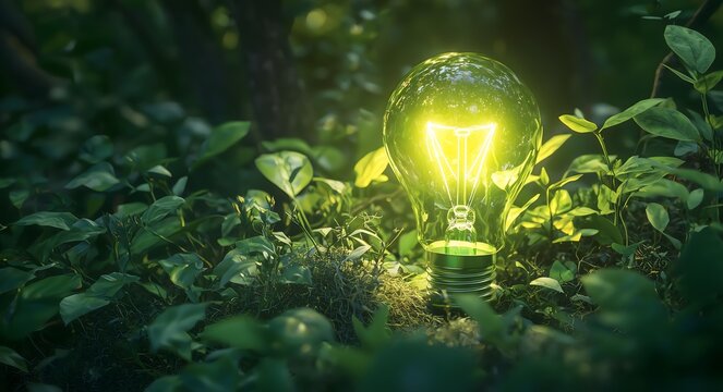 Glowing lightbulb in lush green foliage symbolizes eco-friendly energy