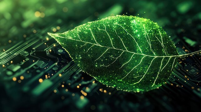 Futuristic tech tree glows with green energy symbol of digital investment in sustainable future. Luminous roots and leaves illustrate growth and ecological innovation