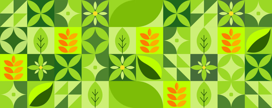 Illustration of a fresh and geometric green leaf seamless pattern with natural abstract shapes