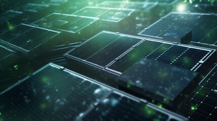 Sustainable energy landscape featuring solar panels, wind turbines, and power lines